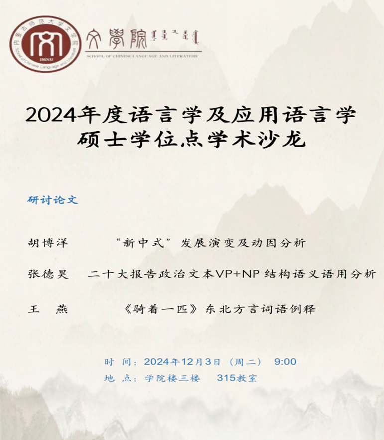2024年12月3日(周二)上午,语言学及应用语言学学位点研究生学术沙龙在盛乐校区学院楼三楼315教室举行。麻彩霞老师、李剑冲老师、任彦老师和学位点全体研究生参加了此次活动。本次学术沙龙活动中,共有三位研究生提交了学术论文,分别是:胡博洋的《“新中式”发展演变及动因分析》、张德昊的《二十大报告政治文本VP+NP 结构语义语用分析》、王燕的《<骑着一匹>东北方言词语例释》。三位同学依次阐述了论文的研究对象、研究方法、基本框架、主要内容和创新之处等。各位老师从论文选题、结构框架、研究内容、研究方法和行文规范等方面对同学们提交的论文进行了细致全面的点评和指导。