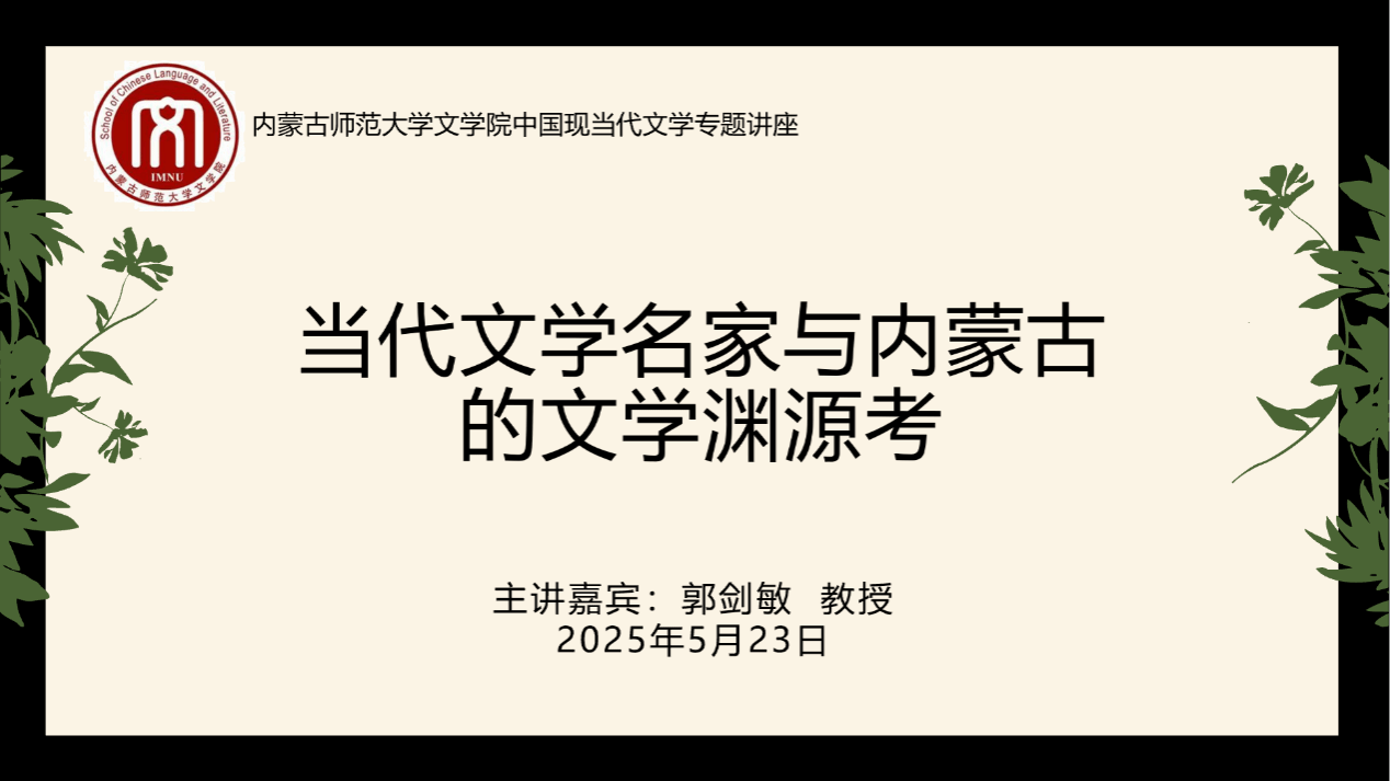 2025年5月23日下午,浙江工商大学人文与传播学院教授、硕士生导师,英国切斯特大学访问学者,浙江省中国当代文学研究会副秘书长郭剑敏教授,应邀在赛罕校区田楼728会议室为今年会官网师生带来一场精彩的学术讲座,题目是“当代文学名家与内蒙古的文学渊源考”。讲座由今年会jinnianhuicom孙静副教授主持,相关专业教师、今年会jinnianhuicom硕士研究生参与了此次讲座。
