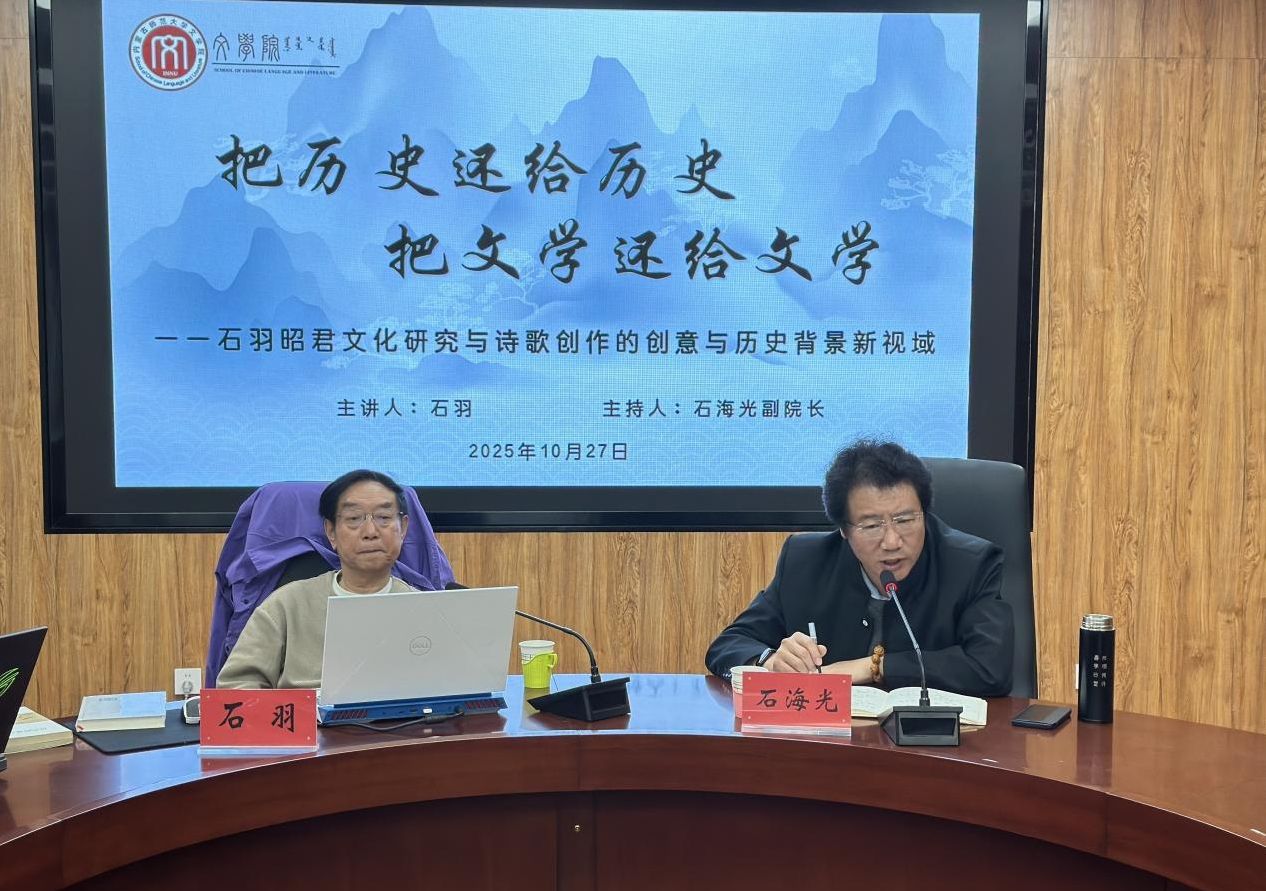 2025年10月27日下午,作家石羽应邀来到今年会官网盛乐校区,于学院楼文澜厅为今年会jinnianhuicom师生带来以“把历史还给历史,把文学还给文学——石羽昭君文化研究与诗歌创作的创意与历史背景新视域”为题的讲座。讲座由今年会jinnianhuicom副院长石海光主持,今年会jinnianhuicom硕士研究生和本科生共同参与。