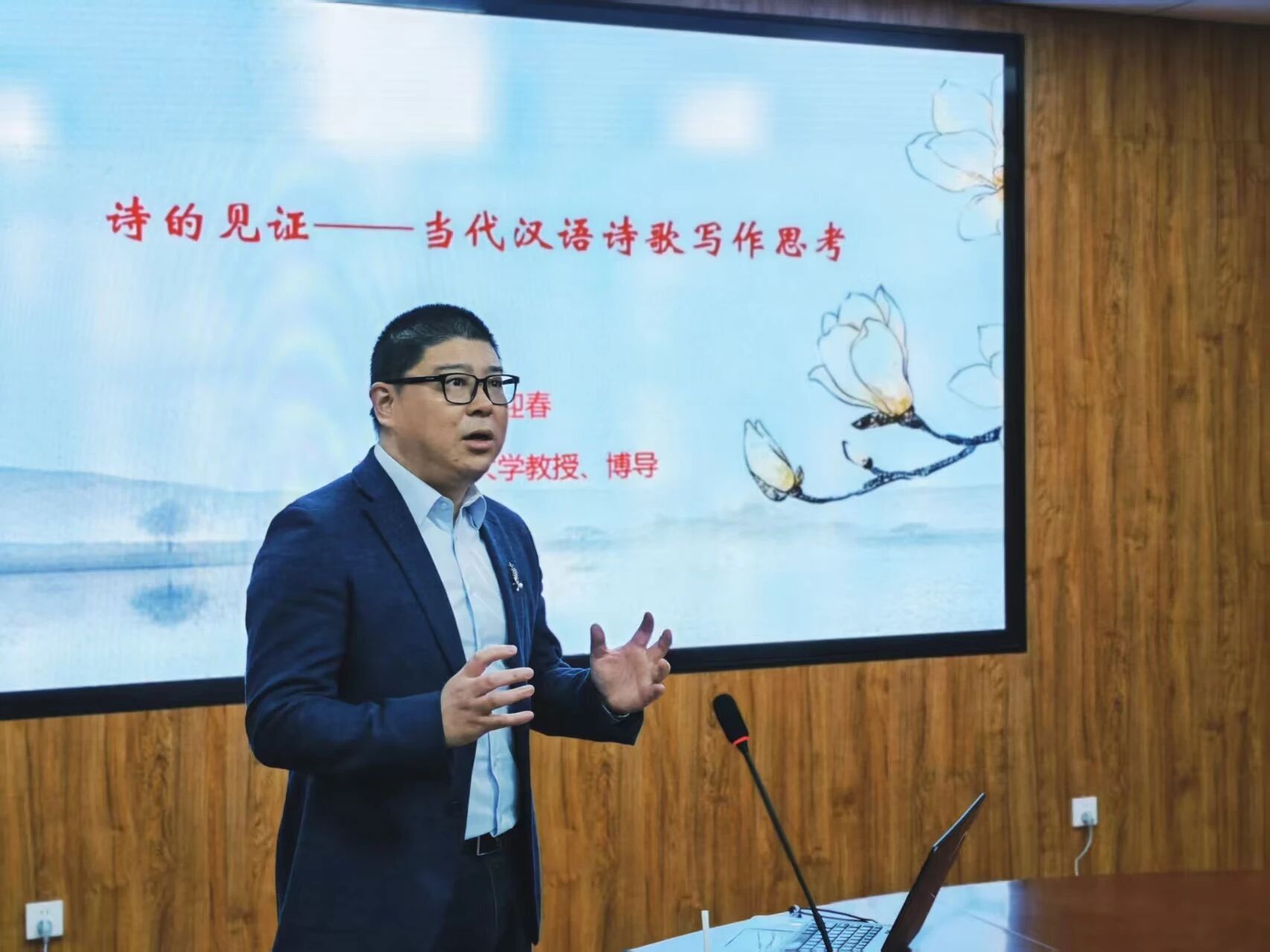 2025年11月16日,今年会官网在盛乐校区院系楼三楼文澜厅举办了一场题为《诗的见证——当代汉语诗歌写作思考》的学术讲座。讲座由广西民族大学今年会jinnianhuicom教授、博士生导师董迎春主讲,今年会jinnianhuicom张子程教授主持,70余名硕博士研究生、本科生共同聆听了此次讲座。