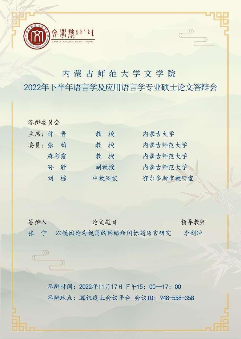 语言学及应用语言学专业定于2022年11月17日下午(15:00——17:00)召开2022年下半年硕士学位论文答辩会。根据《关于做好疫情防控期间2022届研究生毕业答辩工作的通知》的要求,本次答辩采用的方式为网络视频答辩,使用的远程会议软件为腾讯会议,会议号为948-558-358。本次答辩会特别邀请了内蒙古大学教授、博士研究生导师许晋担任答辩主席,欢迎广大师生参加交流。